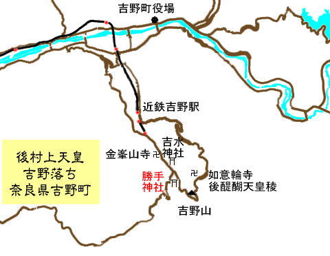 (1)後村上天皇、勝手神社で詠ず 正平三年(一三四八)正月、河内東条に籠り己の建てた作戦に天佑ありと自信満々で勝報を待っていた親房は案に相違して正行一族の玉砕を知る。大いに驚いたが、最早とるべき策はなかった。 『太平記』によると、勝ち誇った師泰の二万余が石川河原に向い、付け城(*1)を構えて東条攻撃にかかったのが八日である。師直が別に三万を率いて吉野に向ったのを知るや、親房は慌てて四条隆資を御所に走らせ、 「正行は既に戦死し、明日にも敵は皇居に迫らんとして居ります。この地はさしたる要害でもなく守兵もありませぬ故、急ぎ今夜中に退去下さい」 と奏上させたと云う。 後村上天皇は訳も判らず夢うつつで馬に乗られ、皇后や皇族を始め公卿、殿上人やその奥方、女官、侍童に至るまで慌て騒いだ。取る物も取りあえず嶮しい山路を辿り、垂れこめる山の雲霧を分けて吉野の奥に迷い入った。 勝手明神(*2)の社を過ぎる時、 ●頼む甲斐 なきにつけても 誓いてし、勝手の神の 名こそ惜しけれ。 と詠じられて行く末を案じている。 (*1)すみやかに敵の城を攻略できそうにない場合、敵城および領内を押さえる要地に、味方の軍勢を置きその周辺地域を鎮圧するために築いた小型の城 (*2)勝手神社。祭神は天忍穂耳尊(あめのおしほみみのみこと)、大山祇命(おおやまつみのみこと)、木花咲耶姫命(こなはなさくやひめのみこと)ほか三神。『古事記』によると、大山祇命の姫神が木花咲耶姫で、この姫神はまた桜の神とされる。 (2)後村上天皇、天川弁財天に到着す 地図作成予定 その責任を負うべき親房は、いち早く東条から水越峠を越えて十津川街道の穴生の里に逃げ走っていたようだ。 後村上天皇の一行は川戸から小南峠を越えて大峯山への登り口である洞川に入り滝泉寺の山伏達に守られて虻峠をあえぎつつ、川合寺から南下すると天川村坪ノ内にある天川弁財天に到着される。 後に日本三大弁天(厳島、竹生島)のトップに置かれる同社の創建は役ノ行者(*1)である。役ノ行者が大峯修行中にまず出現されたのが弁天様だったが、女人禁制の山だけに天川に祭ったと云われる。後に天武天皇(*2)が社殿を築かれ吉野総社とされた。 そして唐から帰られた弘法大師(*3)が高野開山前の三年間ここを根拠とした。また聖宝上人(*4)が大峯中興に励まれ、その奥ノ院として弥山頂上に弁天社を改修された。それにより一段と繁栄して当時の社家、山伏の数も吉野に次いだと云う。 後村上天皇は、この地で足弱な皇后や幼い皇子、内親王、多数の女官達を、七堂伽藍を守る社人、僧兵達に託した。天皇の軍は更に紀伊の山間を踏破して遠く花園、清水、阿瀬川上城を転々とされる。 (*1)えんのぎょうじゃ。役小角。えんのおづの、とも。634年?〜706年?呪術者で修験道の開祖。はじめ葛城山に住み、呪術によって有名に。699年、弟子の讒言で伊豆島に遠流。鬼神を使役して水を汲み薪を採らせ、命令に従わないときには呪で鬼神を縛ったという。『続日本紀』 (*2)てんむてんのう。631?〜686。第40代天皇。672年、壬申の乱で天智天皇(兄)の息子である大友皇子(甥・弘文天皇)を破り、飛鳥浄御原宮で即位。 (*3)こうぼうだいし。醍醐天皇に贈られた名前。774〜835。一般には空海(くうかい)の名で知られる。真言宗の開祖。俗名は佐伯真魚(さえきのまお)。最澄(伝教大師。天台宗開祖)とともに、旧来の奈良仏教から新しい平安仏教へと日本仏教を転換させた。 (*4)しょうぼう。832〜909。諡号は理源大師。真言宗の僧。当山派修験道の祖。天智天皇の6世孫。空海の実弟・真雅の弟子。権勢と一定の距離を置き、清廉潔白・豪胆な人柄で知られる。役行者に私淑して、吉野の金峰山(きんぷせん)で山岳修行。以降途絶えていた修験道、即ち大峯山での修験道修行を復興。 (3)正儀、河内を守る 正月半ば、勝ち誇った師直が「吉野退治」と豪語して三万の大軍を率いて吉野に迫った。しかし山上には最早一兵の影も残っていないのを知って腹を立て、行宮を始め蔵王堂(*1)や宿坊の悉くを灰燼に帰した。 暴行掠奪の限りを極めた師直は当麻寺(*2)に本陣を置いて附近一帯の南軍掃射作戦を展開した。しかし正行亡き後の楠氏三代の棟梁となった三男・正儀の指揮する山民、野伏らの激しいゲリラ戦によって死傷者が続出した。 ばさら(*3)大名の佐々木道誉の子・季宗を始め名だたる勇士が討死し、道誉自身も重傷を蒙ると云う大苦戦で、さすがの師直も閉口して後は弟の師泰に任せて早々に都に引き揚げている。 代った師泰は楠木の本城千早城を攻略すべく河内東条に進攻したが、正儀の巧みな持久作戦に手を焼き、一年後には遂に音を挙げて見るべき戦果もなく都に引上げ、河内は再び楠木一族の支配下に入った。 (*1) 奈良県吉野郡の金峯山寺の本堂。秘仏本尊蔵王権現三体のほか、多くの尊像を安置。「白鳳年間、役行者(えんのぎょうじゃ)の創建」、「奈良時代に、行基菩薩が改修された」と伝えられる。平安時代から焼失・再建を数