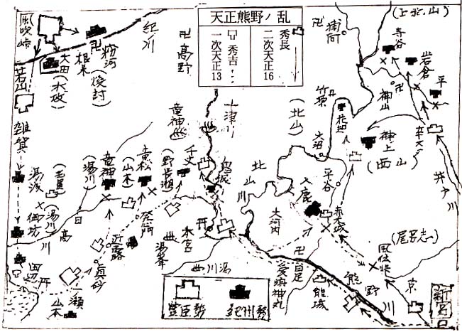 | (1)筒井順慶の没後 天正十二年(一五八四)八月。大和四十万石の大守だった順慶の跡目は「定次若年に就き身分不相応」と云う話も出て問題となった。が、信長に愛されて養子となった程の定次だけに、秀吉の裁定で所領は大和十六万石と河内二万石計十八万石に半減で認めた。 然しこの処置が家中に及ぼした騒動が並大抵でなかったのは、月給を半分にされたサラリーマン以上であったろう。 外様大名らは筒井家から離れて羽柴秀長(*1)に仕えた者も多かったが、一門や譜代家臣ともなればそうもゆかず、禄高半減されても渋々承知せざるを得なかったようだ。 井戸氏に就いても覚弘、治秀、直弘三人で併せて二千石程度が認められているが、大和を離れた良弘に就いてはとても旧領を認めるゆとりもなかった。良弘とてそんな気もなく葬儀を終えると再び熊野に帰って行った。良弘が慌しく王置山麓に急いだのは、かねて知友だった細川幽斉に呼ばれて茶会に出た際、秀長とも同席となり 「兄が家康に味方して大坂城を狙っている紀州勢の態度に怒り、やがて和睦すると紀州を征伐して後の患いを断つ決意である」 と聞かされた後、 「十津川、北山の郷土達に天下の大勢を説き、和解の道を開いて貰えれば伊賀の如き惨禍はさけられ、共に幸甚であるが」 と要請されたからである。 天正十二年(一五八四)秋、良弘は再び霊峰、王置山の英姿を仰ぎ見る熊野篠尾の里に帰った。玉置、本宮一円や戸野、入鹿、竹原の郷士幹部に集合願い、中央に於ける秀吉の動きを詳細に説明した上で、 「秀吉は必ず信雄、家康との和睦を成立させ、現在の畿内に残された紀州征伐を断行して天下人たるの地位を確立するに違いない。織田家の長老・丹羽長秀らも『秀吉の器量たるや古今独歩であり、彼の為す処は大衆も文句なく従う。大衆の帰する処は天下の帰する処であり、余も天の心に従う』と語っている。貴殿らも秀吉の身分の賤しさや“猿面冠者”などの悪名にまよわず、戦国乱世の世を泰平の世となさんとの天の心に素直に従うべきと存ずる」 と諄々と説いたらしい。 然し王置山麓の人々はともかく北山(*2)の後南期の筋目を誇る連中は、伊賀党の悲劇を目でみながら、“鳥なき里のこうもり(*3)”の諺通り 「土百姓上りに屈しては先祖に相済まぬ。井戸殿の好意には感謝するが、こればっかりは」 と頑として承知せず信雄、家康の口車に乗ったらしい。 (*1)ひでなが。1540〜1591。通称、大和大納言。豊臣秀吉の弟。秀吉の片腕として、文武両面で活躍。天下統一に貢献。▽元亀元年(1570) 越前討伐以降、主要な歴戦に参加。天正13年(1585)の紀州征伐後、秀吉から紀伊・和泉などの64万石の所領を与えられる。▽天正13年(1585)6月、四国征伐では総大将。功績を賞されて、大和を加増。郡山城に入り、116万石の大大名に。▽天正19年(1591)1月22日、郡山城で病死。享年52。 (*2)和歌山県北山村。三重県と奈良県に囲まれた全国唯一の飛び地の村。良質の杉に恵まれ林業で栄える。伐採された木材は新宮まで筏で運ばれた。明治22年に七色、竹原、大沼、下尾井、小松の5つの村が合併し、北山村と改称。 (*3)「鳥なき里のこうもり」鳥がいない所では、空を飛べる蝙蝠が威張るという意味で、優れた者がいない所では、つまらない者が幅を利かすということの喩え。 (2)秀吉、紀州征伐を決意する 天正十二年(一五八四)小牧長久手で睨みあっているうちに、秀吉は、和泉に突出した根来、雑賀衆の大阪進攻の動きを見た。そこで秀吉は急いで信雄との単独講和を計る。十一月になると伊勢に進出し、信雄と会見して巧に口説き落した。続いて家康とも講和を結ぶと、伊勢に蒲生氏郷、鳥羽に九鬼嘉隆、そして大和の筒井の上に弟・秀長を配して万全を期した。 明けて天正十三年(一五八五)三月始め、秀吉は足元を脅かした紀伊の鎮圧を決意し、十万の大軍を動員した。眞先に根来寺を槍王に挙げんと、秀長、秀次(*1)には和泉の千石堀砦を、細川、蒲生には積善寺砦攻略を命じる。 秀長の先陣となった筒井定次は 「武名を世に轟かすは此時ぞ」 と伝家の名刀筒井丸をかざして一気に千石堀を攻略した。秀吉は喜んで 「根来寺の先陣も汝に頼む」 と煽り立てる。定次は勇んで風吹峠(*2)を越えて根来寺攻略の体勢をとった。秀吉は、寺領数十万石、僧坊二百、僧兵三万を誇る彼らに 「二万石の寺領を与えるから残りの寺領を返納せよ」 と申し入れたが、日本一の鉄砲集団を誇る僧兵達は頭から相手にせず、三月半ば断呼として戦端を開き必死に戦った。 然し秀吉の大軍の前には問題ではなく、僅か数日で壊滅し全山が炎上した。粉河寺も悉く烏有に帰し、三月末には早くも畠山貞政(*3)の城が落ちる、勝ち誇った秀吉軍は続々と太田(*4)、雑賀党の牙城に迫った。 処が田井ノ瀬で雑賀鉄砲隊に迎撃され死傷続出するや、秀吉は力攻めをさけた。延五十万人を動員して紀ノ川を堰止め、得意の水攻め作戦を展開する。さすが豪強で知られた日前宮(*5)を中心とする