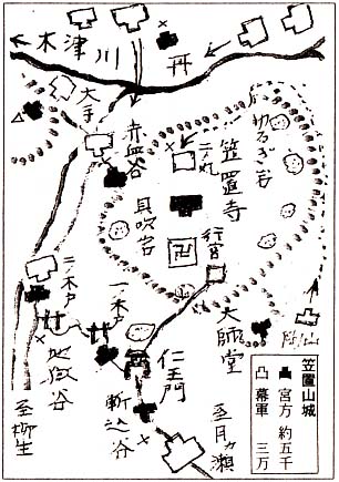 (1)後醍醐天皇の霊夢 元弘元年(一三三一)八月、笠置寺に入られた後醍醐天皇は標高三百米近い岩山の頂上の修行道場を行宮とした。兵を募られたが、大寺や名ある豪族の参ずる者もなく行宮を護る兵も少ない。 天皇は三河の足助党や伊賀、柳生の地侍達に囲まれながら先を案じられていた。或夜、南に枝を拡げた巨樹の下に玉座が設けられて居り二人の童子が現われると 「天下に身を寄せられる場もなき今、しばしはあれにお休みあれ」 と涙を流しつつ、かき消えた夢を見られた。 後醍醐天皇はこれを霊夢と感じられ、南の木は熊野権現の神木の椰であるから童子は権現のお使いであろう、それに木偏に南を書けば楠木となる。 「近くに楠木と名乗る武士はなきや」 と寺の長老に尋ねられた末に楠木正成(*1)を召された、と太平記は述べている。 けれどそれはフィクションであろう。当時の楠木正成は決して一介の郷士等ではなく、幕府の信頼も厚い豪族だ。その所領も和泉、河内、紀伊で併せて七千貫(貫七石と見て約五万石)の大名である。 従って天皇は、かねて俊基からも、宋学にも詳しく文武両道に秀でた尊皇思想の持主である事を聞かされていたに違いない。 (*1)くすのきまさしげ。(?〜一三三六)。武将。幼名、多聞丸(たもんまる)。明治十三年(一八八〇年)に、贈正一位。父は系図により楠木正遠あるいは正玄、正澄、正康、俊親などと伝え、はっきりしない。 (2)楠木正遠(まさとお) 凡そ太平記に登場する何千何万と云う武士の中で最も輝かしい存在は正成である。しかし、その活躍は元弘から延元までの僅か五年に過ぎず、出自に就いても明らかではない。 楠木系図によれば、橘氏で左大臣・橘諸兄(*1)を祖とするが、「正遠─俊親─正成」とするものと、「正俊─正康─正成」の両説がある。正俊の時代に河内金剛山下の七郷を支配し館の周囲に楠が繁っていたので楠木と称されたと云われているが、要するに歴史上では良く判らないのが定説である。 「熊野年代記」によれば、古代熊野の文化的巨人「秦ノ徐福(*2)」を祖とし、その墓碑の眠る「楠薮」と呼ばれる地に住み、代々新宮大社の要職を占める神官であった。 平安の弘仁年間、唐から亡命して来た将兵による南蛮の乱(*3)に熊野三党の軍師として活躍した楠富彦は代々新宮大社の三ノ太夫を勤めていた。この功により一族の中で都に召されて検非遣使に仕えた者がいた。その子孫に楠正定と云う人物がいて、その娘が橘盛仲に嫁いで正遠を生んだと云う。 正遠は本家熊野楠氏の縁により三山神領の下司職などに任ぜられ、河内金剛山麓を本拠とした。姓も楠から楠木と改め、播磨の荘園(*4)まで勢力を伸ばしていったようだ。 その頃、熊野の楠氏は別当嫡流の宮崎家の補佐役として衆徒(僧兵)と飛鳥長床(客僧)を支配し権勢を振っていた。正遠と熊野楠氏は、金剛山頂の修験道場に出入りする山伏達を通じて、昵懇の仲だったらしい。 (*1)奈良時代の政治家。元皇族、葛城王(かつらぎのおおきみ)。敏達天皇の五世子孫。母の姓を継ぎ、橘諸兄に。国政を担当し、聖武天皇を補佐。左大臣、正一位。生前に正一位は日本史上、稀。孝謙天皇の時、藤原仲麻呂(恵美押勝)の力が増し、辞職。以後隠居。 (*2)じょふく。秦(中国。紀元前三世紀頃)の方士。秦の始皇帝に、「東方の三神山に不老不死の霊薬がある」と具申し、財宝と共に数千人を従えて秦から東方に船出した。(司馬遷『史記』)日本各地に徐福伝説があり、和歌山県の那智勝浦町や新宮市が、特に有名。 (*3)熊野伝説。嵯峨天皇の御宇(ぎょう。帝王が天下を治めている期間)弘仁元年(八一〇)十二月二十八日、南蛮の乱あり『外交志稿(外務省)』。新興部族の旧海人系部族に対する制圧戦だったことを想定させる『熊野の伝承と謎(下村巳六)』。諸説あり。 (*4)次節参照。 (3)楠木正成1 河内は清和源氏発祥の地だけに、その守護には源義家以来の名門・石川氏が就任している。楠木氏はその地頭を勤めながら次第に勢力を拡げ、建久元年(一一九〇)頼朝が上洛した際に随行した武士の中に、始めて楠木四郎の名が記されている。 下って永仁二年(一二九四)の東大寺文書によると、播磨の荘園の農民から 「近年、悪党の楠河内入道が年貢を横取りしてしまうのでひどく困っている」 と訴えられているのは正遠らしい。(*1) 大覚寺系に属した河内観心寺(*2)の寺伝によれば、正遠には四男一女があり長男が俊親、次男が正成で、彼は永仁元年(一二九三)の生れと云われる。八歳から十五歳まで同寺で修行した。 生来好学心に富み、学問は天皇の侍僧だった文観(*3)の弟子・滝覚坊(りゅうかくぼう)が観心寺にいたので彼から学んだ。この滝覚坊は和田義盛(*4)の子孫と云われ、特に弘法大師の「心地観経」により四恩(*5)に対する感謝を深く心に刻み込んだと云う。 そして軍学は観心寺から一里ばかり離れた加賀郷二百貫(千五百石)の豪族・大江時親(*6)を師と仰ぐ。かつて大江定基(*7)が中国から翻訳して送って来た「孫子」や六