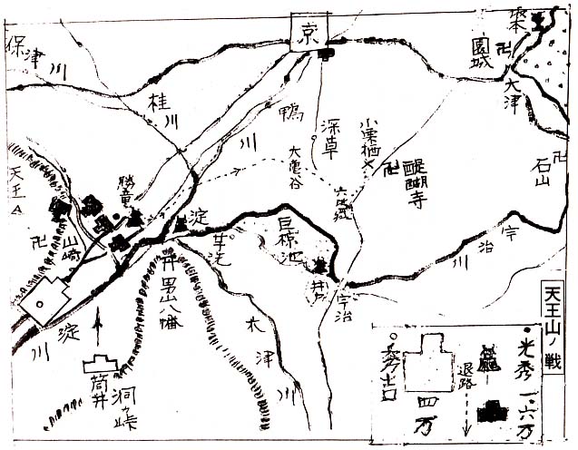 (1)布陣 天正十年(一五八二)六月十二日、光秀は洞ヶ峠(*1)を降りて男山から下鳥羽に本陣を移すと山崎、八幡の兵を撤退させ、淀と勝竜寺(*2)を拠点とした。西国街道を突進して来る敵を山崎の街はずれを流れる円明寺川沿いに迎撃する作戦に変えたのである。 考巧の軍師・斉藤利三が 「四万の秀吉軍に三分の一程度の兵力で決戦を挑むのは不利。ここは一時京をすて近江各地に散在して北に備えている勇将・光春以下五千の兵と合流し、阪本、亀山城によって戦うべきである」 と力説しても光秀は 「京都守護の勅命からもそれは出来ぬ」 と聞かなかった心境は充分察せられる。 「ああ、荒木村重ら一族二万が健在であったら」 と内心痛嘆していたに違いない。 明けて六月十三日、決戦の日は朝から強い雨だった。 光秀は安土城を守る光春らに急ぎ参戦の急使を走らせた。雨の中を下鳥羽から勝竜寺の前方に位置する御坊塚(*3)に本陣を進めたが、その配備は 中央に斉藤、阿閉、柴田、明智茂朝らの近江勢、 右翼天王山麓には松田、並河の丹波勢に伊勢、諏訪、御牧ら旧幕府奉公衆、 左翼には津田、村上らが淀川沿いに守りを固めた。 光秀本陣には筒井から帰った藤田伝五が予備隊として控え、その総勢は一万六千余と伝われる。光秀が最も頼みとする勇将・明智光春以下三千の精鋭の姿が見られなかったのは、何としても惜しまれてならない。 それに対する秀吉軍は、 中央に高山、中川、堀。 右翼淀川堤に池田、加藤、木村。 左翼天王山麓には秀長、黒田が布陣、 続いて秀吉本陣、蜂谷、丹羽、 殿軍は信孝で、總軍三万九千余がびっしり両国街道を埋めていた。 光秀と親交のあった吉田兼見卿がこの日に下鳥羽から山崎近くまで来て観戦しているのは帝の内意を受け「何とか光秀が勝ってくれぬか」と神に祈る気持ちだったろう。 (*1)京都府八幡市八幡南山。かつて東高野街道の中継地。現在はその少し東を国道1号(枚方バイパス)が通り、交差点の名前として『八幡洞ヶ峠』がある。峠だが、曲がりくねった道はなく線形の良い道路。 (*2)しょうりゅうじじょう。京都府長岡京市に所在した。城名は、付近の同名古刹に由来。本丸および沼田丸趾が1992年(平成4年)に勝竜寺城公園として整備された。 (*3)御坊塚(境野古墳群)は、京都府大山崎町の東北端に位置する。サントリー京都ビール工場の裏手にあり、御坊塚(境野古墳群)と光秀本陣跡の標識がある。 ![]() (2)開戦 戦端が切られたのは午後四時過ぎ天王山方面だったと云われる。やはり天王山が戦局を左右する重要地点となった。寡兵ではあっても自由に地の利を選べた明智勢だけに、もし織田軍の中でも「明智の鉄砲隊」で知られた精鋭三千が勇将・光春に率いられて街道を見下す天王山に堅陣を築いて居れば戦局は大きく変ったに違いない。 緒戦は戦さ上手で知られた斉藤勢が凄しい戦さぶりで高山陣を圧して優勢を示した。伊勢ら幕府奉公衆が予想外な奮戦を見せたのは 「この一戦に勝てば再び将軍義昭を京に迎えて幕府再興を実現出来る」 と云う期待感からだろう。 緒戦の不利を感じた秀吉は、弟・秀長と黒田、堀軍に 「何としても天王山を攻め取れ」 と叱咤し、本陣一万の精鋭のすべてを山崎の隘路に投じる。それと共に右翼の第一線の猛将達に 「一気に円明寺を突破して淀川沿いに敵の左翼を包囲せよ」 と激励。猛将・池田勝入斉や加藤光泰らが勢い立って斉藤勢に襲いかかった。 その朝、筒井順慶は、秀吉、長秀から 「きっと命じる、信孝様に従って淀川際に陣取り油断なく救攻せよ」 と厳命されていた。しかしこの時、筒井勢一万が峠を下り、突如淀川を渡河して秀吉本隊の背後を突けば、待ち構えていた良弘らは勇躍これに呼応し、戦局は一変したろう。 残念ながら戦場に筒井の梅鉢の馬印は姿を見せなかった。 (3)明智光秀、勝竜寺城に退く 二千に満たぬ斉藤勢は包囲されて崩れ始める。予備隊となった明智の猛将・藤田伝五が名題の押し太鼓を轟かせて猛反撃を展開し、戦局は一進一退を繰返す。しかし、山ノ手の明智の勇将・松田太郎左衛門らが討死した為に、遂に天王山は秀吉勢の手に帰し、破局はここから始まった。 激闘二時間にして明智の第一線で奮戦を見せていた斉藤、藤田隊も死傷続出して崩れた。奉公衆の御牧兼顕が本陣に急使を走らせ 「戦さは早これまででござる。身共は残る将士と共に敵陣に突入して討死仕れば殿には一刻も早く勝竜寺に退き後図を計られますよう」 と進言する。 光秀は 「死なば共にぞ」 と残る旗本隊の全力を投じて最後の一戦を敢行せんとしたが、老臣・比田帯刀が駒の口論にすがりつき、 「日頃冷静な殿にも似ぬお振舞、例え此場は破れても安土、坂本、亀山には光春殿始め五千の味方が健在であり、再挙は決して不可能ではありませぬ、ここは先ず勝竜寺に移られませ」 と無理やり引き揚げさせた。 (4)明智光秀、落ちる 光秀も思い直して城に退ったが、明智軍の討死は三千を越え傷者を加えれば万に