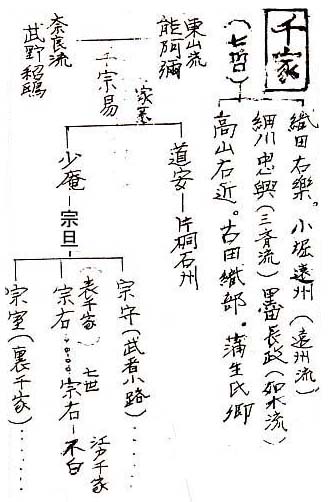 | (1)家康の十男の頼宣、紀州に入国す いつしか歳月は流れ元和五年(一六一九)、かねて幕府から睨まれていた福島正則が城を勝手に修理したと因縁をつけられて信州に追われた。代りに浅野家が大坂陣の功として三万石を加増され、芸州四十二万石の大守として転封された。 そして紀州には家康の十男で十八歳の頼宣が、紀伊三十七万石、伊勢松坂十八万石、計五十五万石の御三家当主として入国する。 紀州は難治の国と云うので、第一に頑丈な牢獄を建てて威厳を示した。そして幕府天領である大和十津川との領界を改め、領内各地の由緒ある豪族に地士の身分や扶持米を与えて家門の誇りを認めている。 そして紀州家の付家老には田辺の安藤、新宮の水野、田丸の久野が独立大名扱いで任命された。他に直参旗本が与力として着任し、治政に当って居り、井戸泰弘は直轄領本宮の御目見得地士に選ばれたようだ。 (2)川上亀次郎、千ノ宗右に入門す それにしても何とか其後の史料が残っていないかと色々調べているうちに百年近くをへた享保年間(一七一五〜一七三五)に興味ある資料を見つけた。 ここで茶聖千ノ宗易をめぐる茶道系図を調べて見ると次の通りである。(次表)