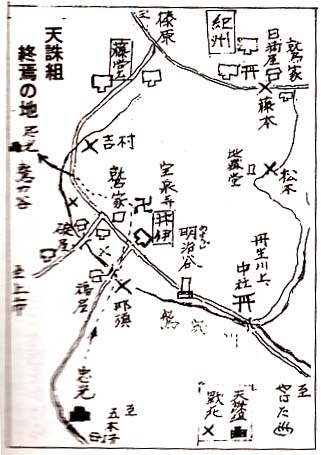 那須らの決死隊が斬込んだのは夜の七〜八時頃だったと云う。その状況は別図の通りである。 那須ら一騎当千の猛者揃いとは云え、銃は白川林泉寺で焼き捨て、一剣のみで斬りこんだのだから、井伊の鉄砲隊によって空しく怨を呑んだらしい。 (*1)Chap 4暁闇の巻 -天誅組秘聞-4.2 緒戦を参照。 (*2)明治12年(1879)、初代新宮戸長に任命される。旧藩で柔術師範をつとめ、仲ノ町で柔術道場を開いていた。 (http://homepage3.nifty.com/ryokodo/kmx7.html) (3)三総裁の最期〜松本奎堂、藤本鉄石〜 那須信吾らの犠牲によって中山忠光らは一気に敵陣を突破して鷲家に向った。しかしそこには紀州田丸の家老・山高、以下数百の兵が篝火を燃やし、手ぐすねをひいて待っていた。 到底突破は無理と思われので 「ここで解散してめいめい思い通りに落ち延び他日を期そう」 と協議し、忠光は上田、伊吹ら六人と鷲家谷の北の山中に分け入った。 傷病者組にいた吉村寅太郎(*1)ら三総裁は、忠光らより遅れて五本桜についた。折から鷲家口の方角で激しい銃声が轟いているのを聞いて、藤本鉄石、松本奎堂(*2)は進路を変え、丹生川上神社中社から御殿越しの山道に入り、その夜は伊豆尾村の庄屋・松本清兵衛の邸にかくまわれる。 然し翌二十五日、紀州勢に探知されて、盲目の松本奎堂は敢なく銃殺された。 藤本鉄石は従者と共に当時は紀州領の本陣・日裏屋に斬り込み、家老の山高らを震い上らせると、力戦の後に学者とは思えぬ壮絶な最後をとげる。 (*1)Chap 4暁闇の巻 -天誅組秘聞-4.1 序曲を参照 (*2)Chap 4暁闇の巻 -天誅組秘聞-4.2 緒戦を参照。 (4)三総裁の最期〜吉村寅太郎〜 吉村寅太郎は二十四日夜、傷に苦しみながらも気力は衰えず、人足達を 「辛抱せよ、辛抱したらきっと新しい世が来る。それを楽しみに耐えるのじゃ」 と励ましつつ、本隊の跡を追った。しかし途中、銃声に恐れた籠人足に逃げられ、木津川村の庄屋・堂本孫兵衛の土蔵にひそんでいた。 けれど追手が迫るのを感じると、主に迷惑をかけられぬと、二十七日の夜半に出発し、鷲家谷に辿りつき猪小屋でかくれているのを藤堂隊に発見された。いきり立って乱射する味方を、 「憂国の士を銃で討ちとってはいかん」 と止めた上野撤兵隊の金谷健吉は白刃をかざして迫り、重傷の吉村は討取られる。 彼は死に臨み「残念!」の一語を残して倒れたと云われる。村人はその遺骸を鷲家川畔の巨岩の根元に埋葬し“残念将軍之墓”なる石碑を立てて供養した。 処がその碑が不思議にも彼の霊力が宿ったか、万病を直す霊験をあらわし、やがて各国から参詣人が殺到することになる。 (5)安積五郎、伴林光平、水郡善之祐 鷲家口を辛うじて脱出した志士達も次々に捕われた。 藤堂藩に捕えられた軍師・安積五郎(*1)、小姓・顕澁谷ら九名は、島ヶ原の観菩提寺に預けられ、その好遇に 「何とか貴藩で処刑して貰いたい」 と嘆願している程だが、翌年二月、伴林光平(*2)らと京の六角牢で処刑された。 竜神温泉で捕わった河内勢の水郡善之祐(*3)らも紀州藩の志士としての待遇に感謝し D鬼神も 恐れざりしが、誠ある 人の情に 袖ぬらすらん。 と詠じている。ちょうど蛤御門の激斗(*4)の最中だったため、裁判もなく、平野国臣(*5)ら三十二名と共に惨殺されている。 長州に逃れた忠光を始め、百余名の隊員中で明治の世にめぐり合えて“功なり名をとげた”ものは、平岡(*6)、伊吹(*7)、程度である。 すべて二十〜三十代で散っているのは昭和の特攻隊そのままで、何とも哀れである。 (*1)Chap 4暁闇の巻 -天誅組秘聞-4.2 緒戦を参照。 (*2)Chap 4暁闇の巻 -天誅組秘聞-4.2 緒戦を参照。 (*3)Chap 4暁闇の巻 -天誅組秘聞-4.2 緒戦を参照。 (*4)禁門の変(きんもんのへん)。元治元年(1864)に起きた事件。蛤御門の変(はまぐりごもんのへん)とも。▽長州の積極派が、討薩賊会奸を掲げて挙兵。京都蛤御門付近で長州藩兵が、会津・桑名・薩摩各藩の諸隊と衝突、尊皇攘夷を唱える長州勢は壊滅。 (*5)Chap 4暁闇の巻 -天誅組秘聞-4.1 序曲を参照 (*6)平岡鳩平。維新後、北畠治房と名を変え、司法官として横浜、京都、東京の裁判所長、大阪控訴院長を歴任して男爵まで上り詰めた。大正10年(1921)、八十九歳で死す。 (http://www13.plala.or.jp/shisekihoumon/higashiyoshino1.htm) (*7)石田 英吉(いしだ えいきち)(1839〜1901)。坂本龍馬門下。土佐国の人。変名を伊吹周吉。▽土佐藩の医師の家に生まれる。家業を継ぐため大坂の適塾で緒方洪庵に師事し医術を学んだ。志士・吉村寅太郎に心酔し天誅組に加わって大和挙兵に参陣。敗れた英吉はやむなく長州に落ち延び再起を図るが、蛤御門の変で負傷。 三条実美ら有力公卿が都を落ち延びたいわゆる「七卿落ち」で三条とともに都を離れた。その後、再び長州に逃れた英吉は、そこで高杉晋作と合流し奇兵隊創設に貢献するなどして過ごした。坂本龍馬と接触をはじめるのはこの頃からである。▽以後、優秀な人材を買われて龍馬の側近くで活動。亀山社中成立の頃より竜馬に従い、のち海援隊創設時